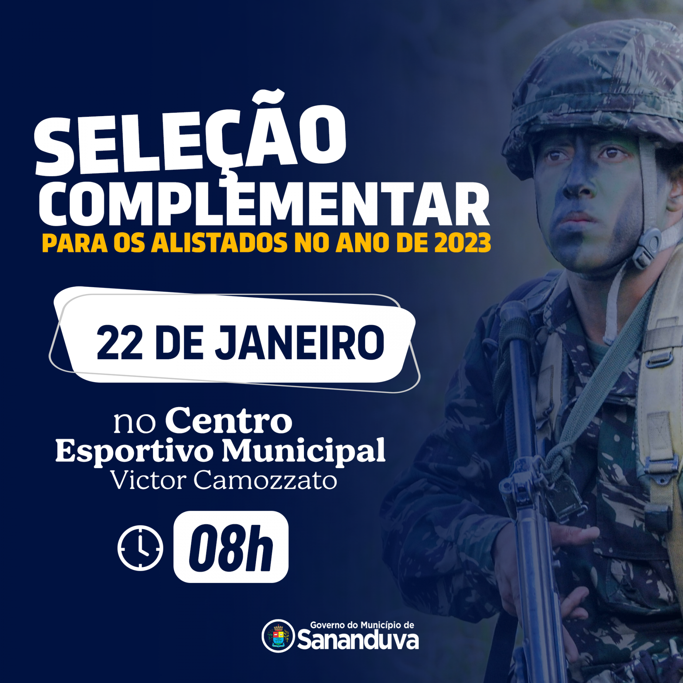 No dia 22 de janeiro, às 08h, no Centro Esportivo Municipal Victor Camozzato vai acontecer a seleção complementar do Exército para os jovens alistados no Serviço Militar obrigatório no ano de 2023.