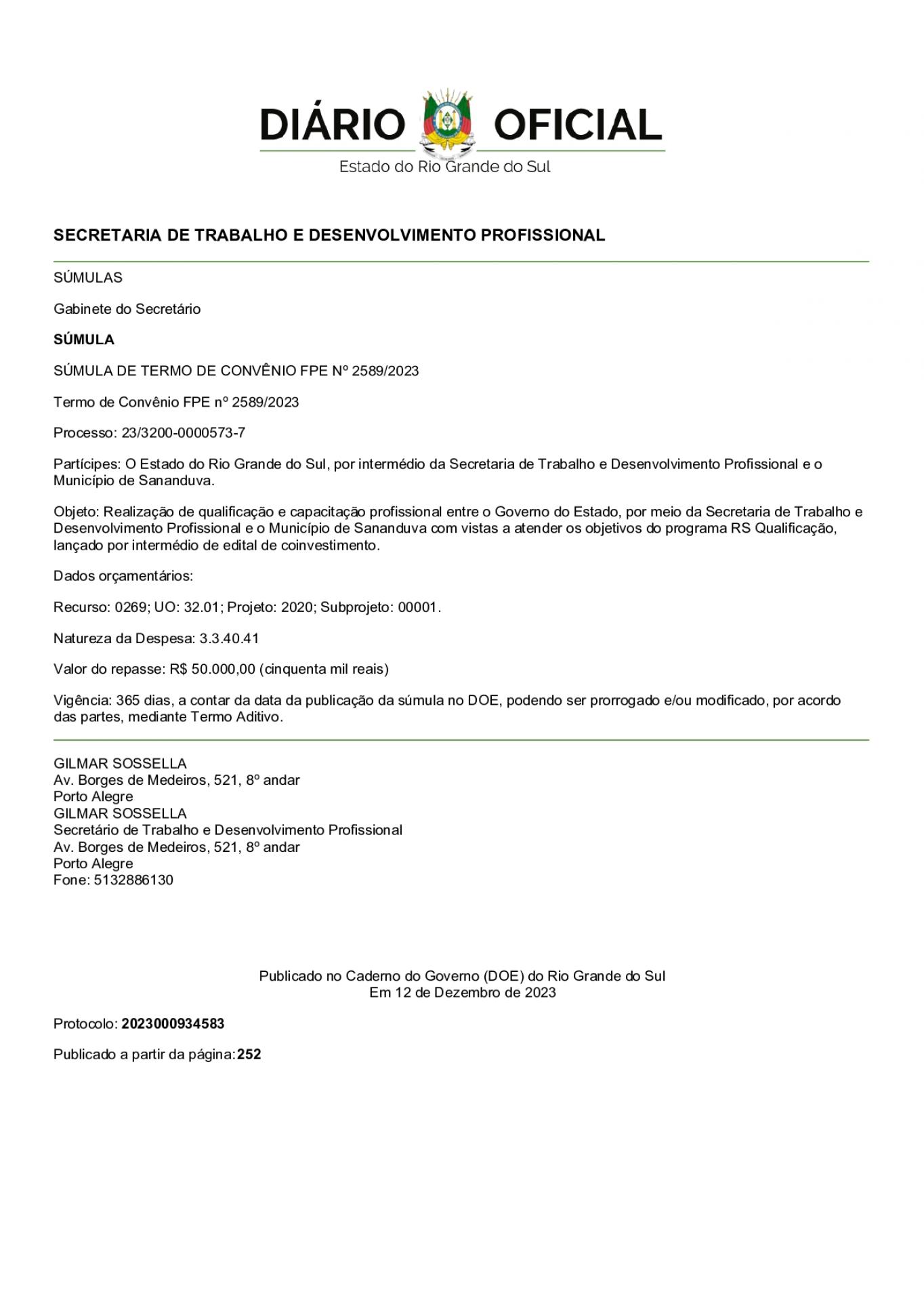 A Súmula de Termo de Convênio pode ser acessada no Diário Oficial do Estado do RS pelo link https://www.diariooficial.rs.gov.br/materia?id=934583.
