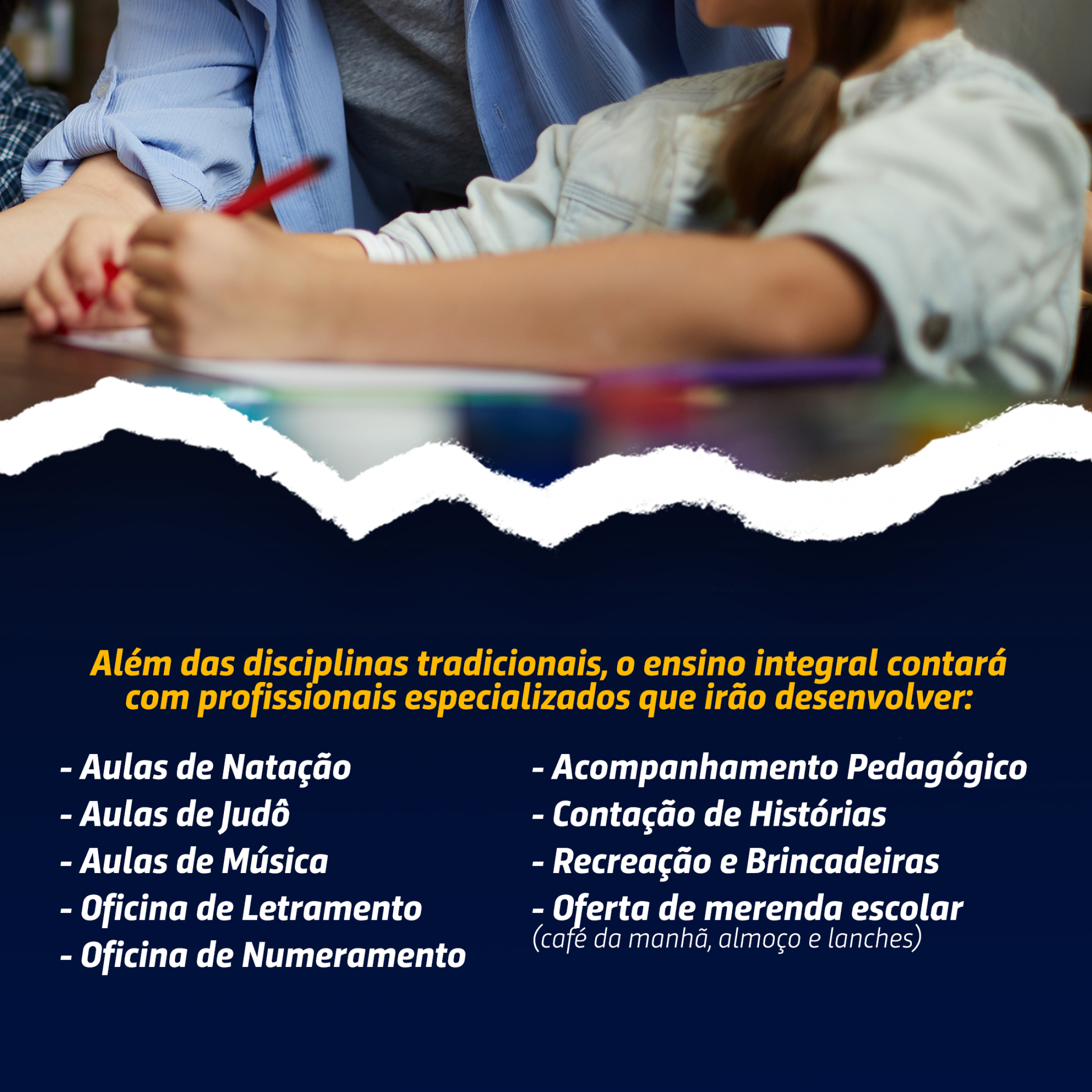 Além das disciplinas tradicionais, o ensino integral contará com profissionais especializados que irão ministrar aulas de natação, judô e de música, oficinas de letramento e numeramento, contação de histórias, recreação e brincadeiras. Os alunos também terão acompanhamento pedagógico e a oferta de café da manhã, almoço e lanches.