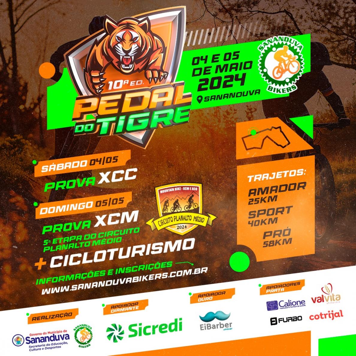 Nos dias 04 e 05 de maio o Parque Municipal de Eventos Frei José vai receber a 10ª edição do Pedal do Tigre e, também, a 5ª etapa do Circuito Planalto Médio 2024 de Mountain Bike.