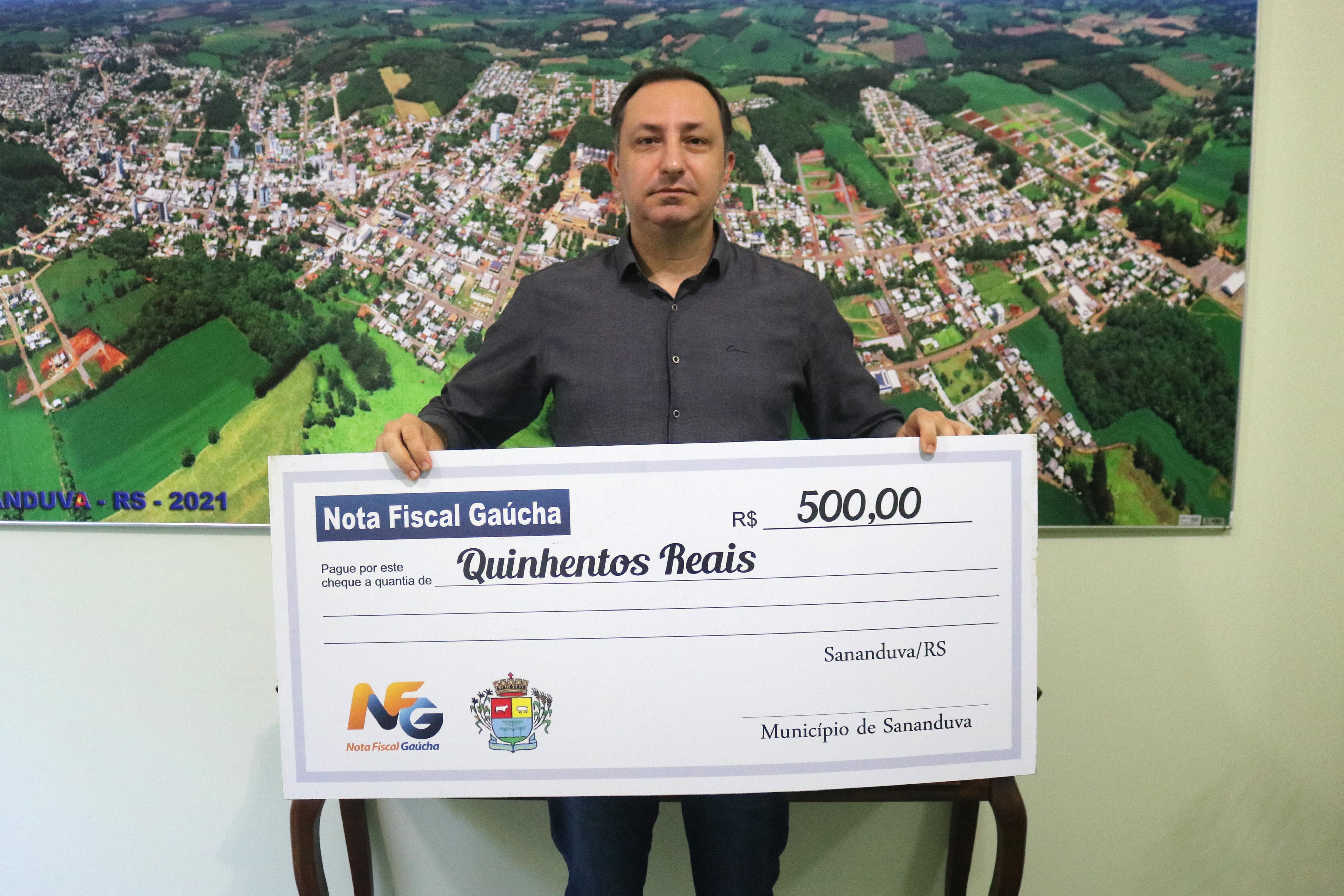 O munícipe Marcelo Bogoni foi o premiado no sorteio municipal do mês de maio do Programa Nota Fiscal Gaúcha. Ele realizou compras no comércio local e informou o seu CPF na Nota Fiscal, gerando números para concorrer aos R$ 500,00 sorteados mensalmente.