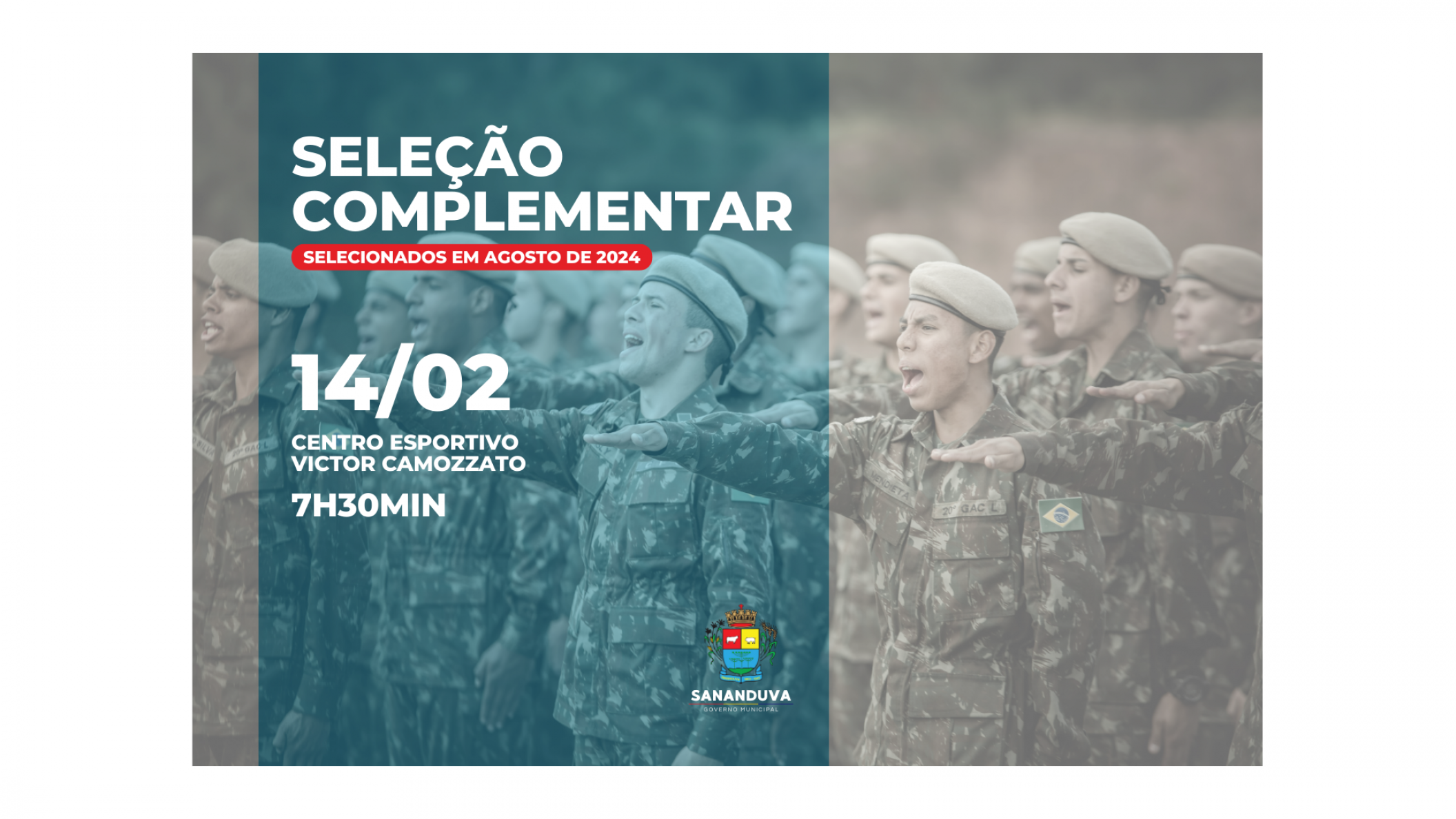 Selecionados no alistamento militar de agosto de 2024 devem comparecer no ginásio de esportes Victor Camozzato, em Sananduva, no dia 14/02/2025, às 7h30min.