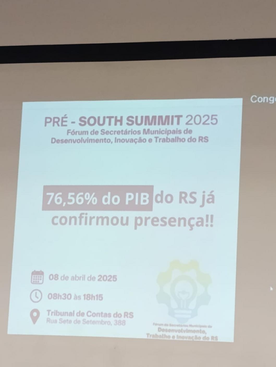 No dia 8 de abril, véspera do South Summit, o Secretário Municipal participou do Fórum Estadual de Secretários Municipais de Desenvolvimento, Inovação e Trabalho do RS, realizado no Tribunal de Contas do Estado. O evento reuniu cerca de 300 representantes municipais e estaduais para debater políticas públicas voltadas à inovação, empregabilidade e desenvolvimento econômico.