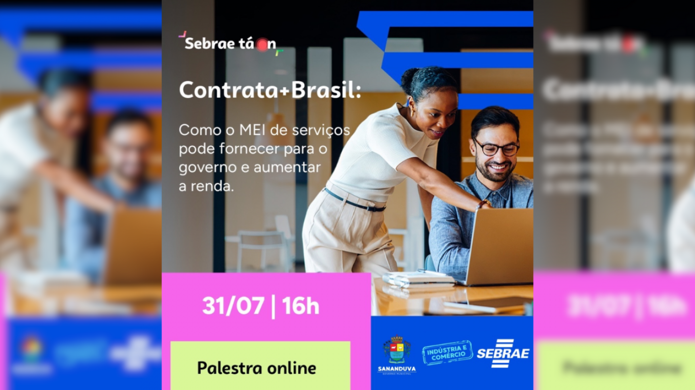 No dia 31 de julho (quarta-feira), às 16h, será realizado um evento online e gratuito promovido pelo Sebrae, com foco em orientar os MEIs prestadores de serviços sobre como participar de contratações públicas por meio da plataforma Contrata+Brasil.
