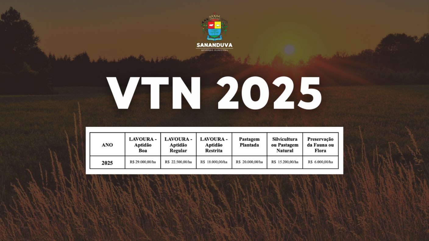 O Governo Municipal de Sananduva, por meio da Secretaria do Planejamento e Administração, em parceria com a Receita Federal, informa que já estão disponíveis os valores do VTN – Valor da Terra Nua, válidos para o exercício de 2025, conforme estabelece a Instrução Normativa RFB nº 1.877/2019.