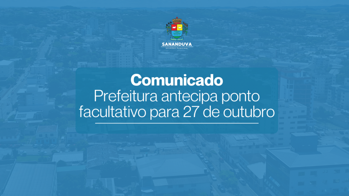 O Governo Municipal de Sananduva informa que o ponto facultativo alusivo ao Dia do Servidor Público foi antecipado para o dia 27 de outubro de 2025 (segunda-feira), conforme determina o Decreto Municipal nº 8.074.