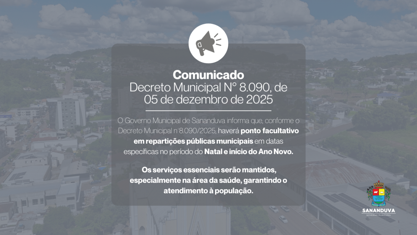 O Governo Municipal de Sananduva informa que, conforme o Decreto Municipal nº 8.090/2025, haverá ponto facultativo em repartições públicas municipais em datas específicas no período do Natal e início do Ano Novo.
